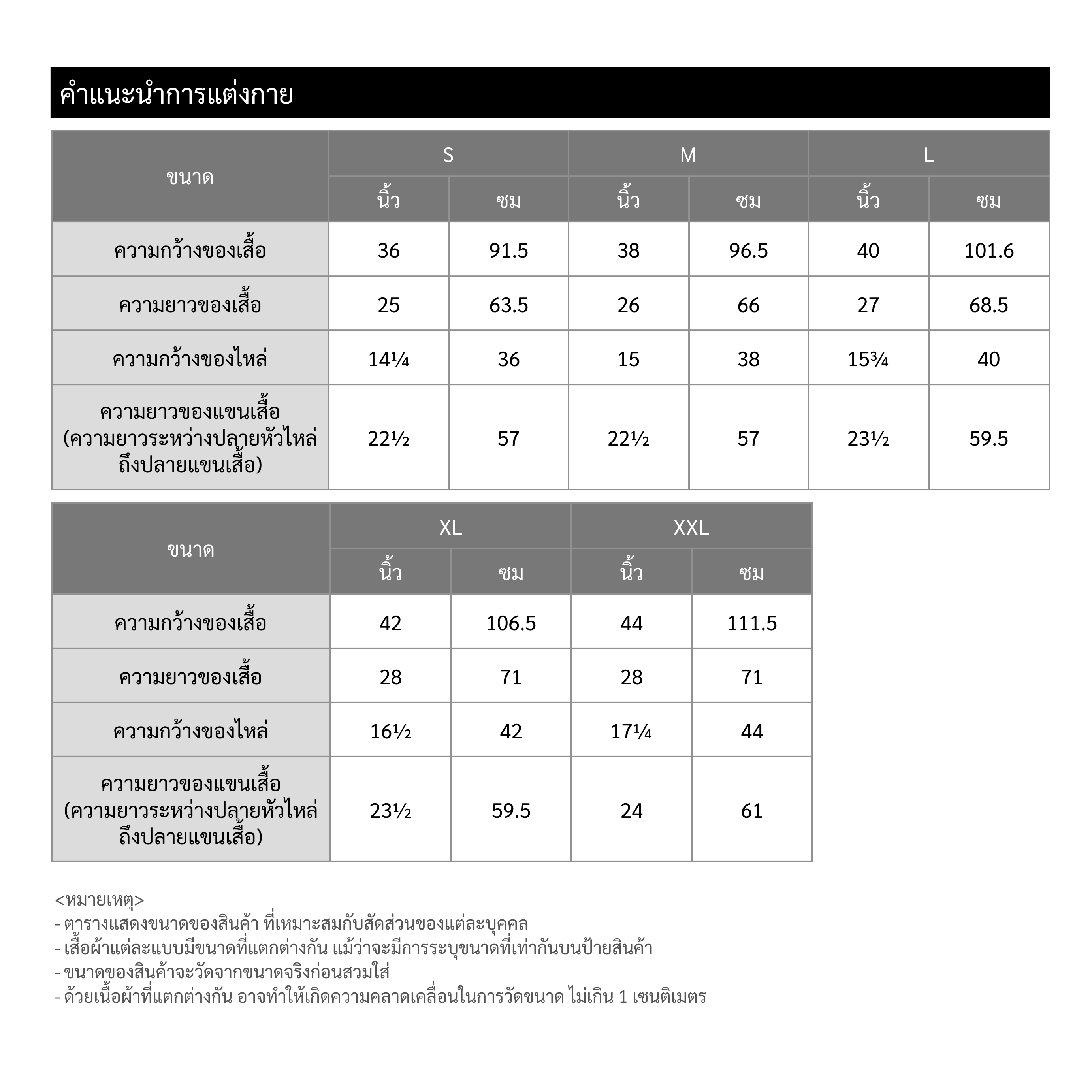 ขนาด S ความกว้าง 91.5 / ความยาว 63.5 / ความกว้างไหล่ 36