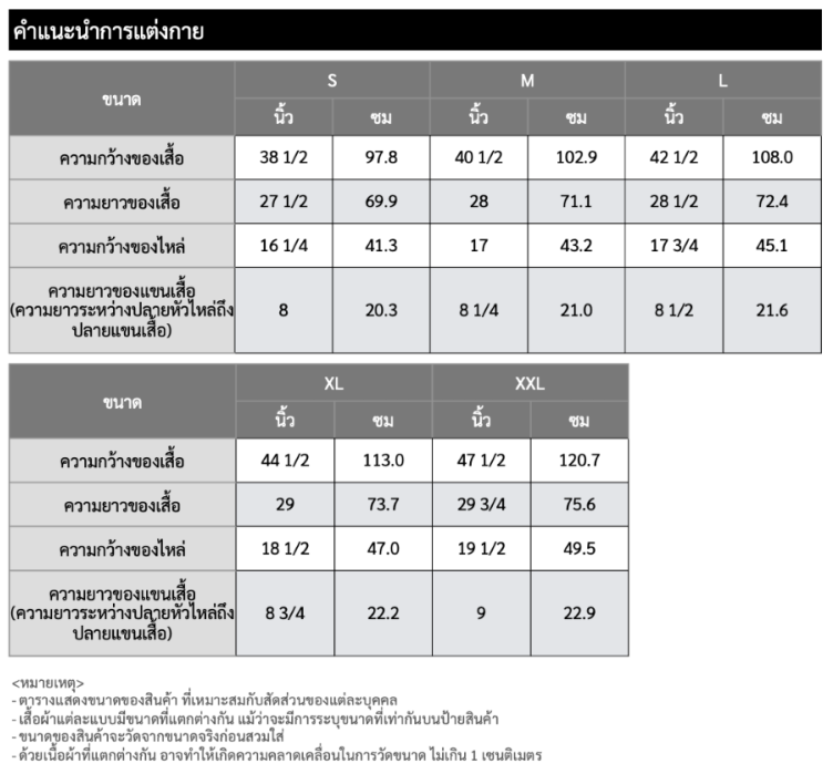 ขนาด XXL ความกว้างเสื้อ 120.7 / ความยาวเสื้อ 75.6 / ความกว้างไหล่ 49.5