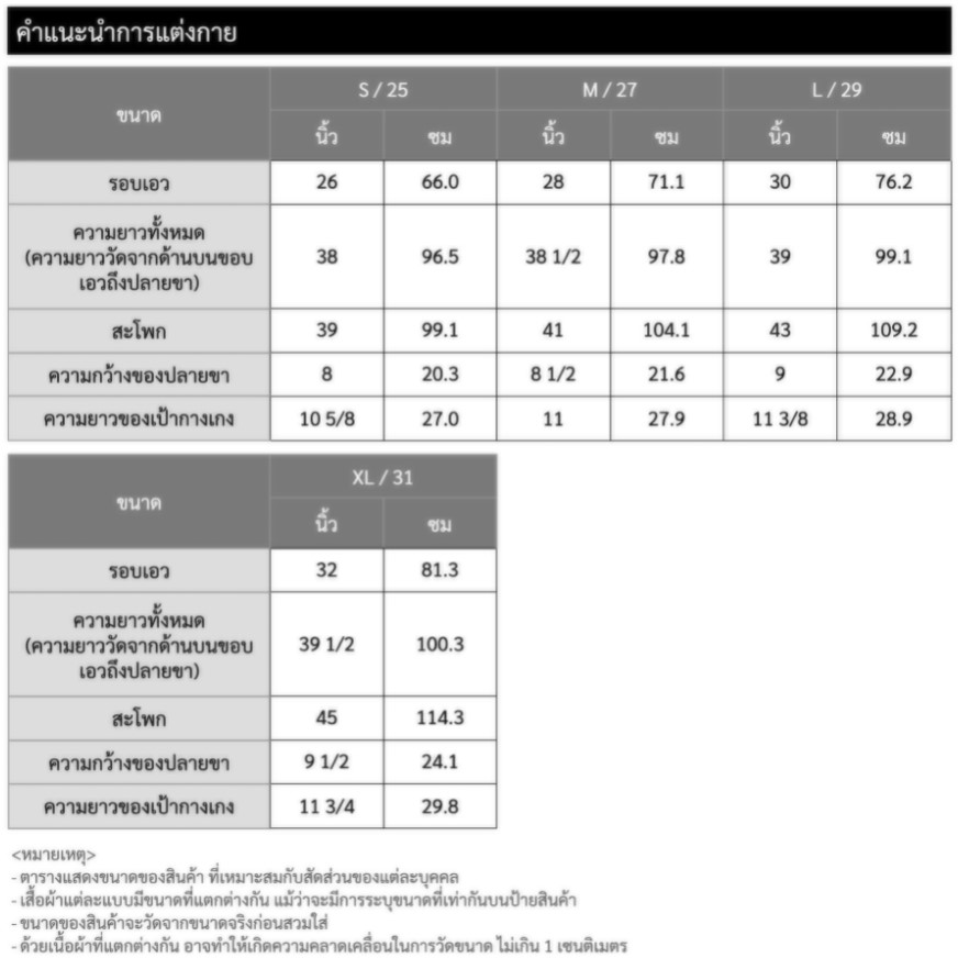 ขนาด XL : รอบเอว 81.3, ความยาวทั้งหมด 100.3, สะโพก 114.3, ความกว้างของปลายขา 24.1, ความยาวของเป้ากางเกง 29.8