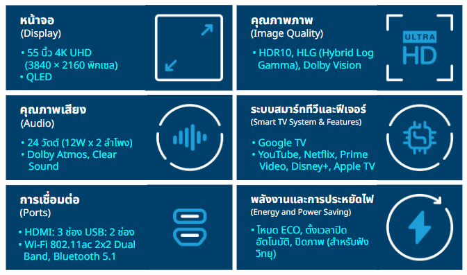 • ขนาดหน้าจอ: 55 นิ้ว 4K Ultra HD (3840 × 2160 พิกเซล)