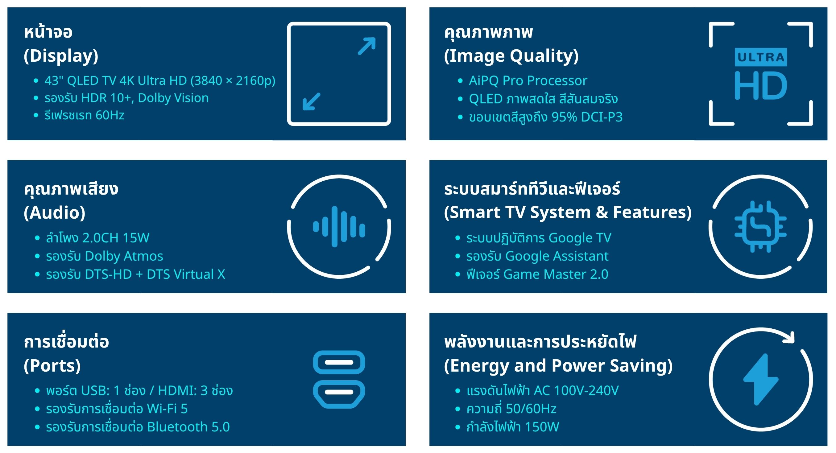 • ขนาดหน้าจอ 43 นิ้ว แบบ Flat LCD QLED