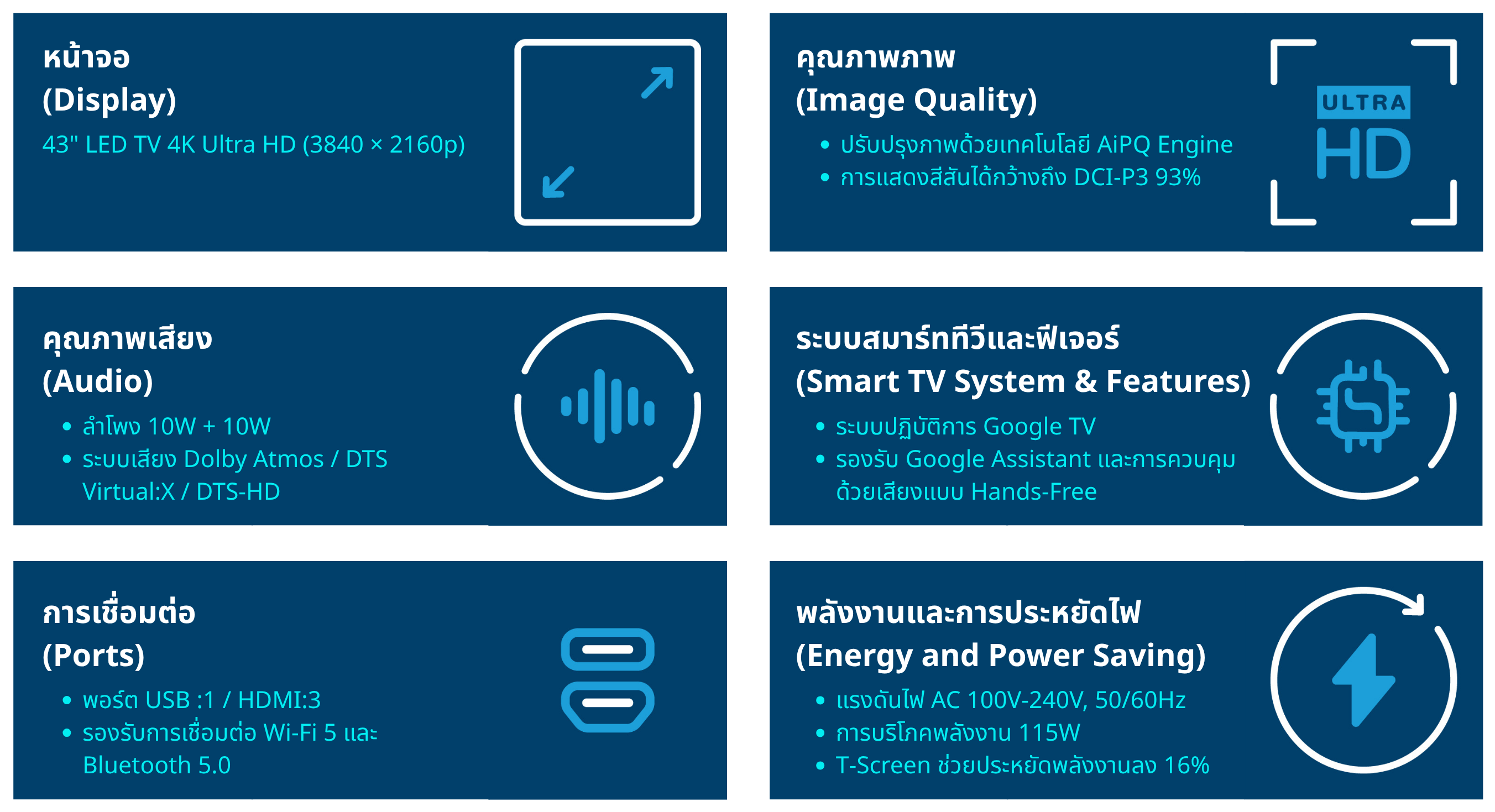 • ขนาดหน้าจอ: 43 นิ้ว 4K Ultra HD (3840 × 2160 พิกเซล)
